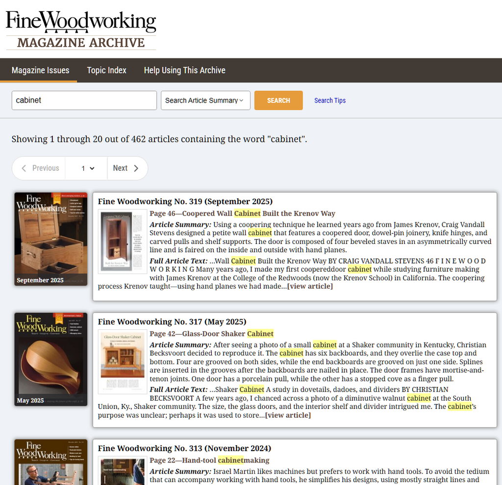 The archive is conveniently searchable by keyword, author, title, subject, or full text, making it easy to locate, select, and print the topic or project you're looking for and bring it right to the shop. And every technique and tip you find here is shop-tested and comes from a working pro, respected instructor, or seasoned craftsman.